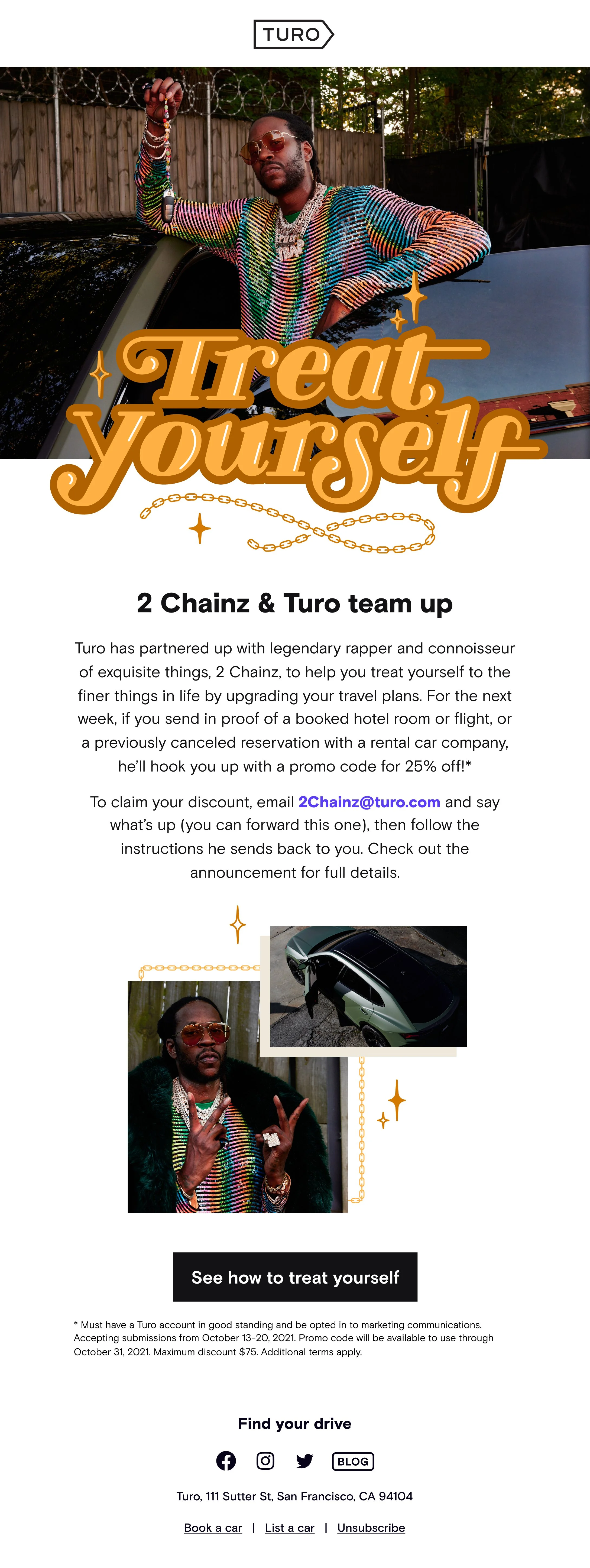 In collaboration with 2 Chainz, Turo ran a digital campaign encouraging guests to treat themselves to 25% off a booking. I was the designer on the project and chose to hand-letter its lockup, giving the branding the luxurious treatment it deserved. This element served as a through-line connecting all assets across social, email, blog and PR.
